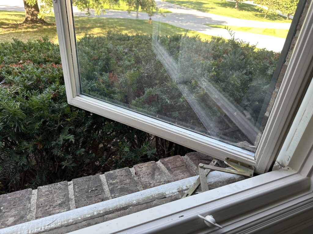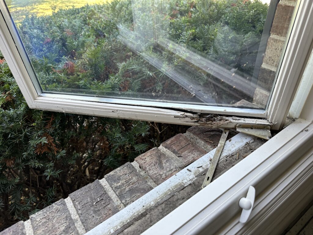This casement window had severe wood rot along the bottom of the sash, caused by long-term moisture exposure. The damaged wood weakened the structural integrity of the sash and prevented the crank hardware from operating properly.